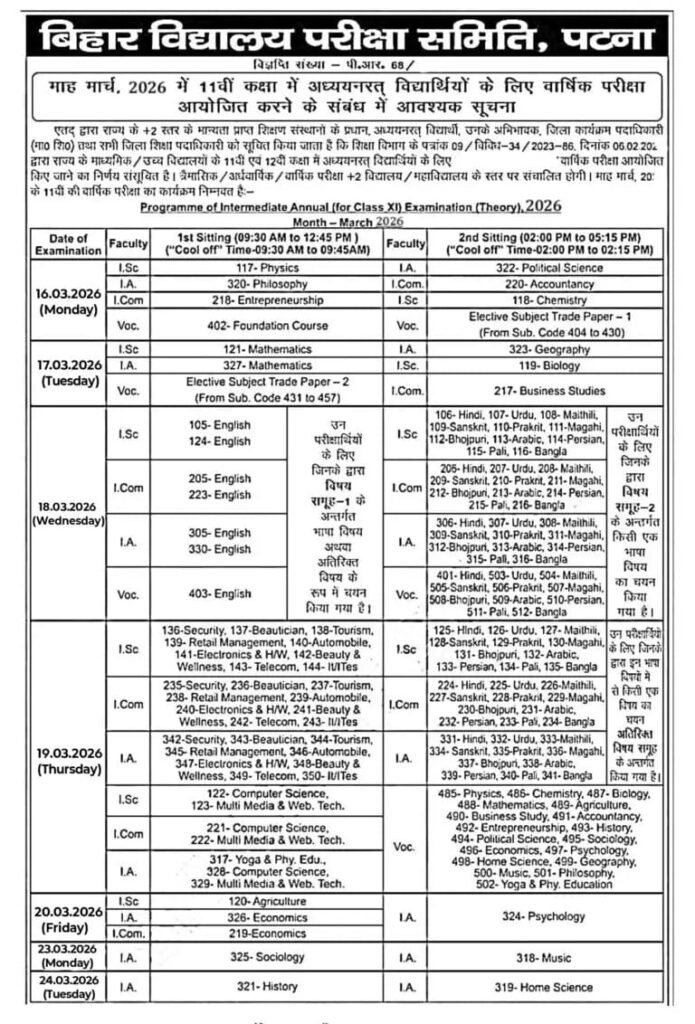 Bihar Board 11th Exam Routine 2026 जारी: नमस्कार दोस्तों-बिहार बोर्ड से कक्षा 11वीं में अध्ययनरत छात्रों के लिए बड़ी खबर सामने आई है। Bihar Board 11th Annual Exam Routine 2026 आधिकारिक रूप से जारी कर दिया गया है। अब सभी छात्र–छात्राएं अपने वार्षिक परीक्षा कार्यक्रम के अनुसार तैयारी को अंतिम रूप दे सकते हैं। यह परीक्षा मार्च 2026 में आयोजित की जाएगी और इसमें विज्ञान (I.Sc), वाणिज्य (I.Com), कला (I.A) तथा व्यावसायिक (Vocational) संकाय के विद्यार्थी शामिल होंगे।