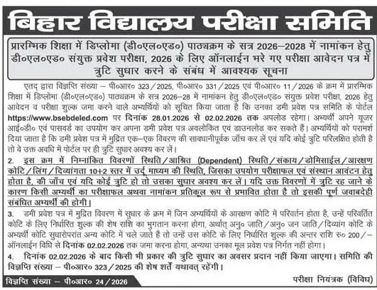 Bihar DELED Dummy Admit Card 2026 को बिहार विद्यालय परीक्षा समिति द्वारा आधिकारिक रूप से जारी कर दिया गया है। जो भी अभ्यर्थी D.El.Ed Joint Entrance Exam 2026 के लिए आवेदन कर चुके हैं, वे अब अपना डमी एडमिट कार्ड डाउनलोड कर सकते हैं और उसमें दिए गए सभी विवरणों की अच्छे से जांच कर सकते हैं।