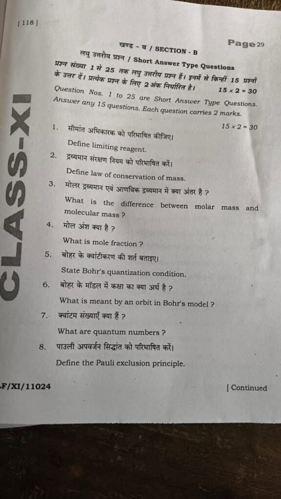 BSEB Class 11 Chemistry Half Yearly Exam Question Paper 2025 – Highlights
