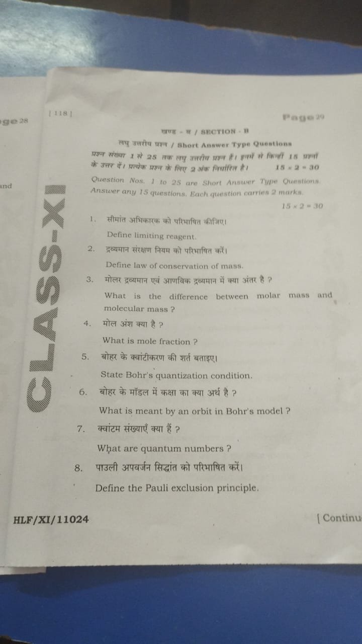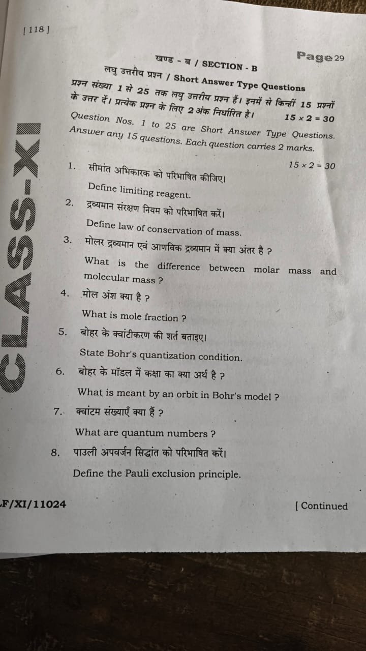 | BSEB Class 11 Chemistry Half Yearly Exam Question Paper 2025 | Download Pdf |