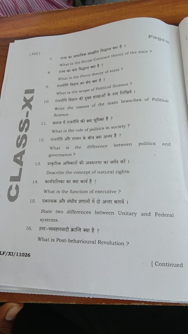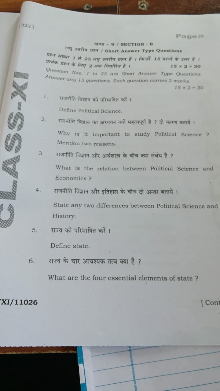| BSEB Class 11 Political Science Half Yearly Exam Question Paper 2025 | Download Pdf |