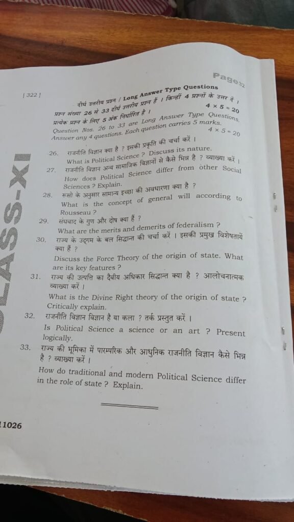 BSEB Class 11 Political Science Half Yearly Exam Question Paper 2025 – Highlights