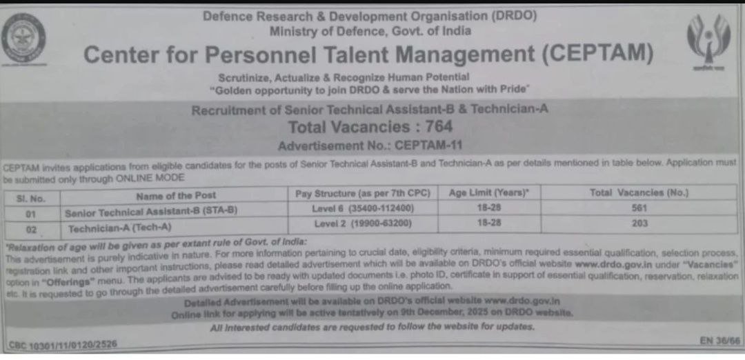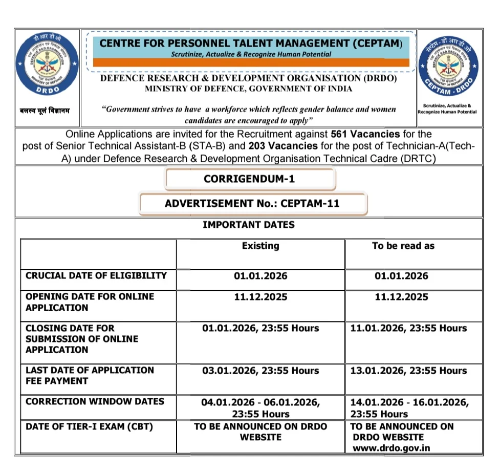 - परीक्षा का नाम: DRDO CEPTAM-11 Examination 2026